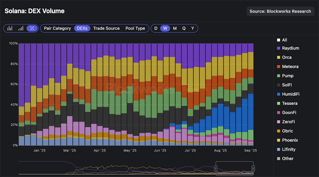 September will mark the first month ever in which prop AMMs (HumidiFi, SolFi, etc.) surpass traditional AMMs (Orca, Raydium, etc.) in monthly Solana DEX volume. When SolFi launched in October 2024, all prop AMMs combined accounted for just 7% of total volumes on the chain. This month, HumidiFi alone has accounted for 28% of total DEX volumes.