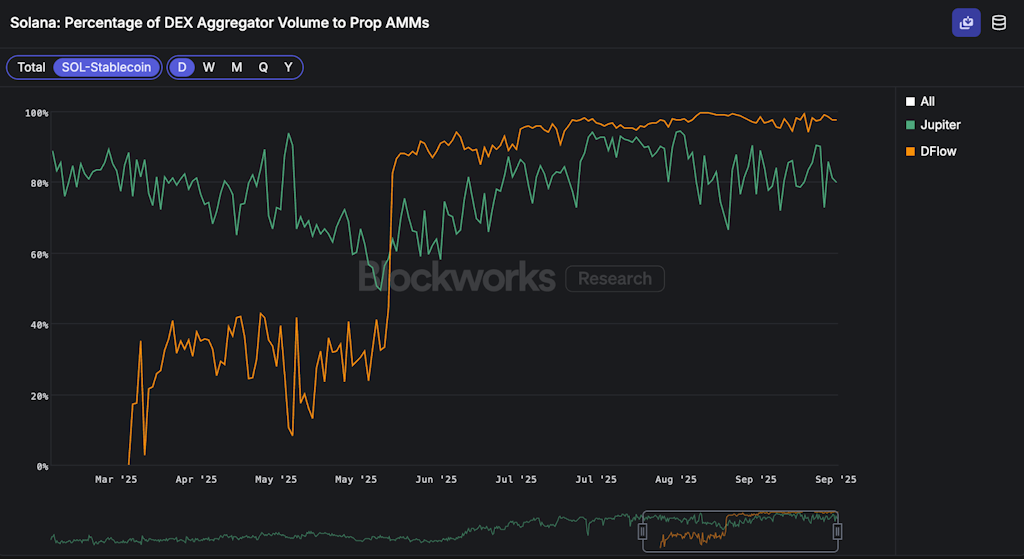 The chart below shows that DFlow and Titan’s volumes have increased dramatically since late August, averaging approximately $1.5 billion in combined volume over the past two weeks. Note that Titan’s recent surge is due to its public launch on Sept. 18, with the team reporting that their proprietary algorithm is outperforming competitors’ pricing 87% of the time. For the reduced competition argument to be valid, all aggregators would have to collude to maintain the same prop AMM integrations when, in reality, the opposite occurs. Aggregators are actually incentivized to integrate new routes as fast as possible to maintain or increase their routing win rate.