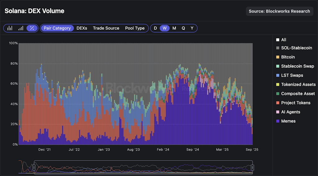 The rise of prop AMMs is one of the most interesting things happening on Solana today, and I think we are still grasping their full implications. For instance, last week SOL-stablecoin volumes accounted for 74% of total DEX volumes on the chain, a figure we haven’t seen in over four years! Concurrently, memecoin volumes have fallen down a cliff, with a 10% market share last week, the lowest share since December 2023.