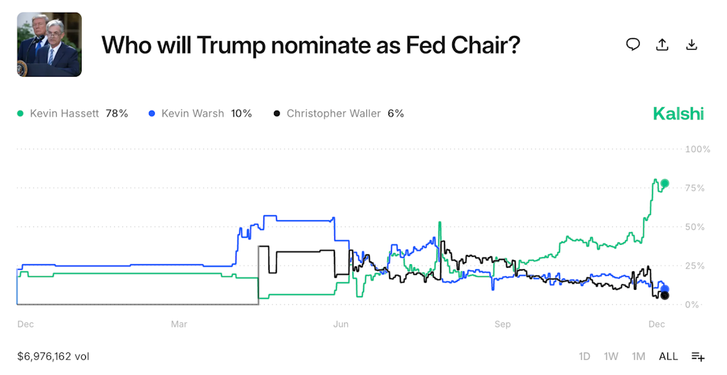 Odds have surged (up to 78% on Kalshi) that Kevin Hassett will be President Trump’s next Federal Reserve chair nominee, an announcement Trump recently confirmed is imminent. Hassett, a close White House ally, is favored because he aligns with the president’s demand for much lower interest rates to provide cheaper consumer loans and mortgages.