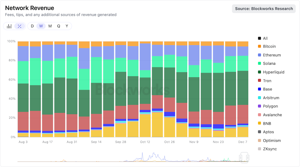 In terms of network revenue, we’re seeing similar figures to what we saw the week prior, with Hyperliquid leading the charge with 35% of all network revenues, followed by Tron (20%) and Solana (15%). Noticeably, BNB revenue is still at lows following the highs it put in October, and the majority of that has been captured by Hyperliquid and Solana.