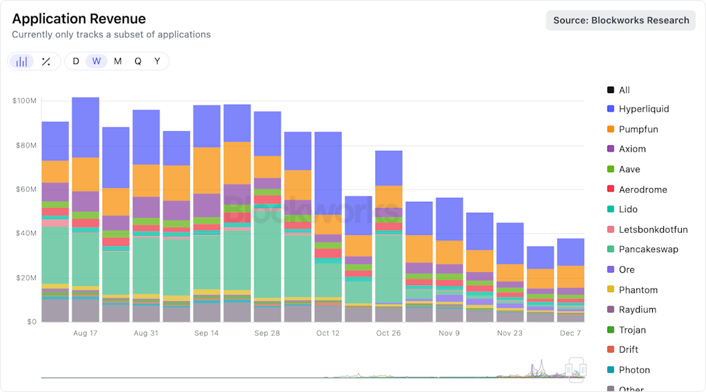 Application revenue has stopped declining (now at $38 million, 10% higher than last week), following four weeks of net decline across all tracked applications. Hyperliquid continues to lead the way (35%), followed by pump.fun (25%) and Axiom (8%).