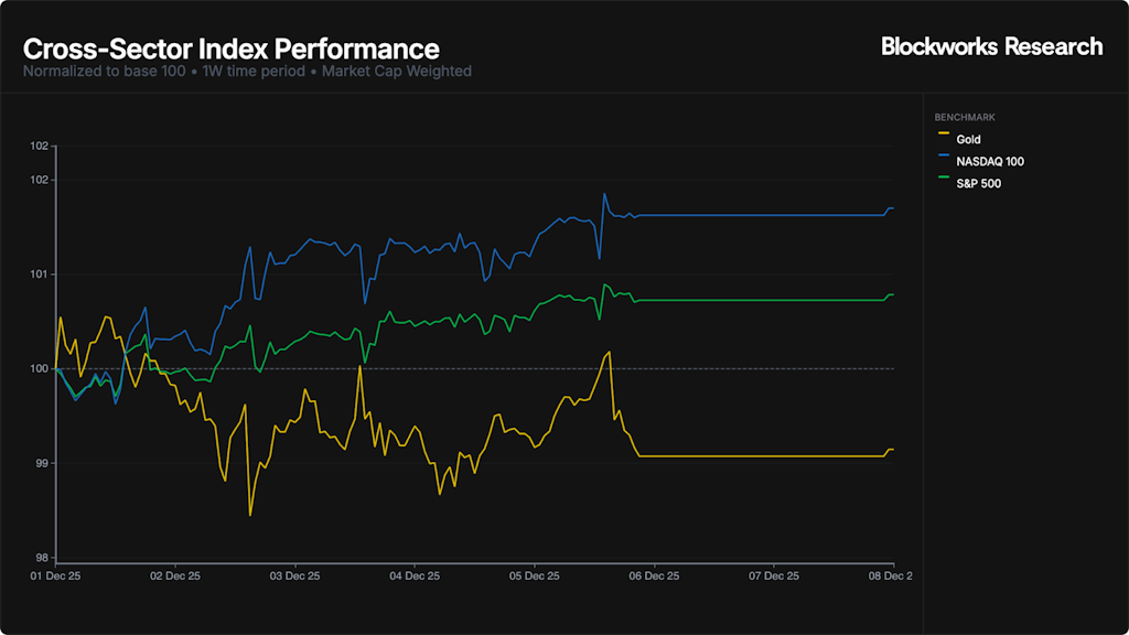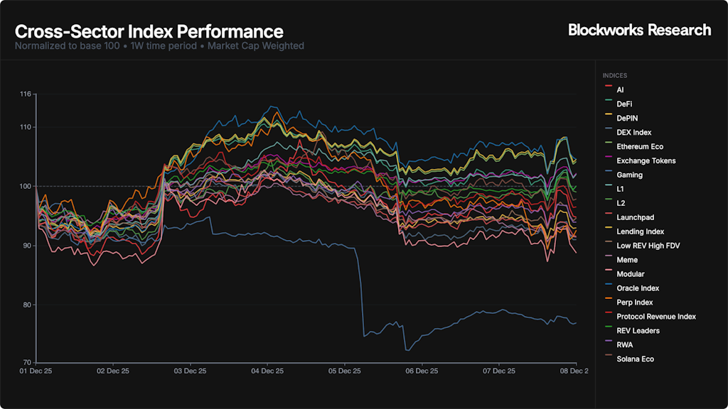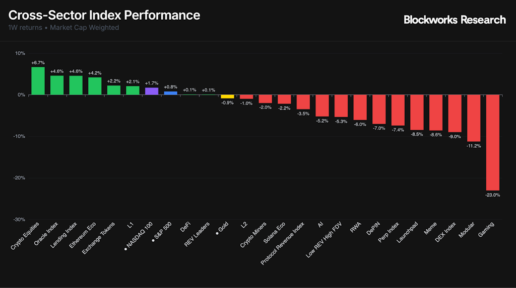Over the past week, oracles, lending and Ethereum ecosystem tokens performed well, with each up just over 4%. Crypto equities performed the best, up 6.7%, primarily due to outperformance by HOOD.