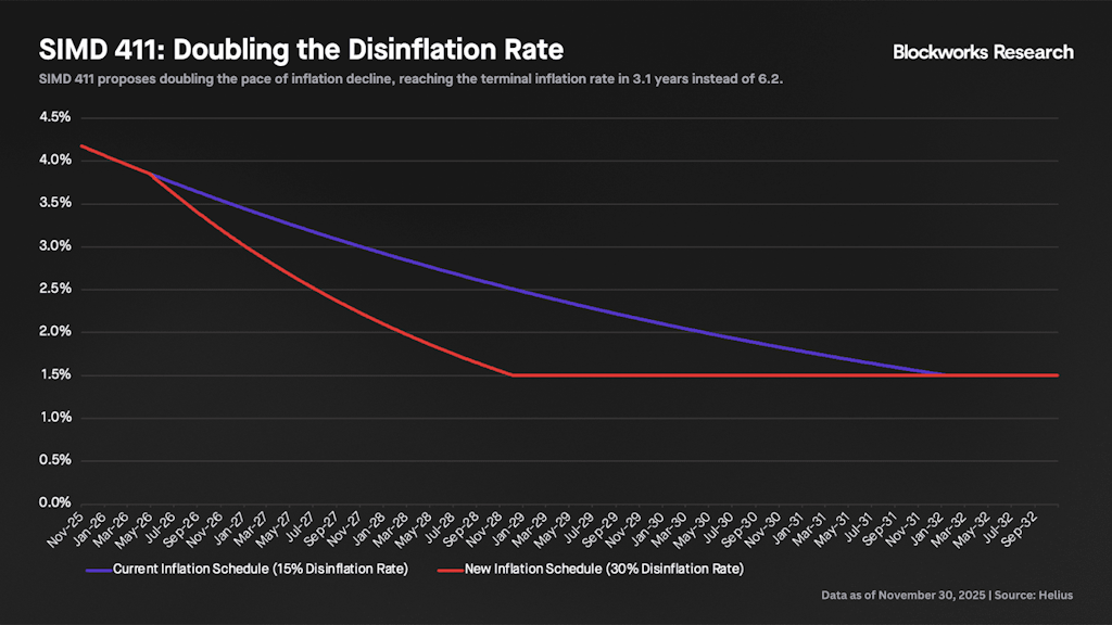 Helius’ Lostin and Ichigo proposed SIMD411, which aims to accelerate Solana’s emission schedule by doubling the disinflation rate from -15% to -30%, keeping the 1.5% terminal inflation unchanged. This simple, predictable parameter change would bring inflation from ~4.14% today to 1.5% in ~3.1 years (early 2029), rather than ~6.2 years (early 2032). If implemented, SIMD411 would cut 22.3 million SOL ($2.9 billion) in emissions after six years vs. the current inflation path, reducing the “leaky bucket” sell pressure.