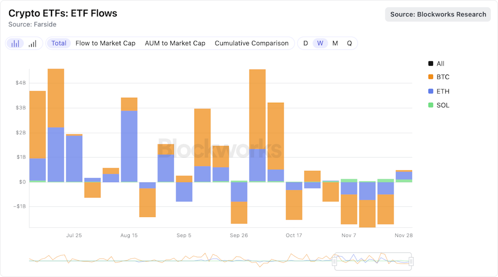 The first week of December has been the first positive net inflow week for BTC ETFs since the last week of October, with $70.2 million in net BTC ETF inflows. Ethereum and Solana ETFS have both seen higher net inflows this past week, at $312 million and $108 million, respectively.