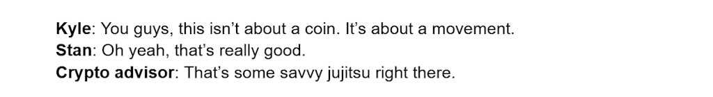 Later, when Stan and his crypto advisor are brainstorming how to “create FOMO” for a South Park memecoin, they mistake Kyle’s moral rebuke for a marketing pitch: