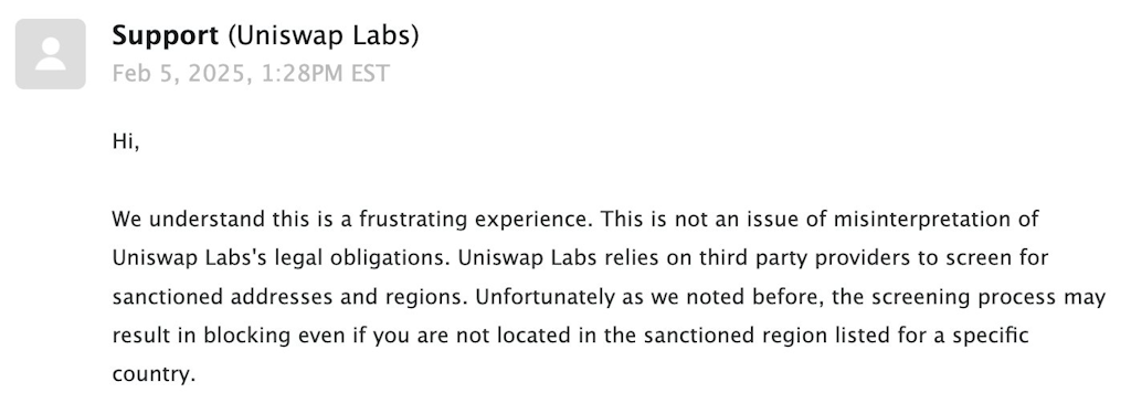 The Uniswap support team’s response from February suggests they’ve taken a blanket approach to adhering to sanctions by blocking entire countries via “third party providers.”