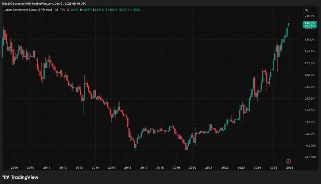 On the rates side, Japan is again reactivating the yen-carry unwind. Two-year Japanese Government Bonds (JGBs) trade near 1%, 10-year yields are around 1.9%, both the highest since 2008. Overnight Interest Swaps now price about 80% odds of a December hike from the BOJ.