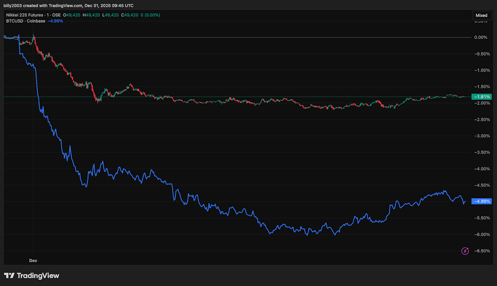 The last surprise move in mid-2024, when the BOJ lifted rates to 0.25%, drove a sharp USD-JPY reversal and contributed to a near 30% BTC drawdown to roughly 49K as macro books de-grossed risk. A similar pattern appeared today, with BTC tracking the Nikkei lower during Asia hours.