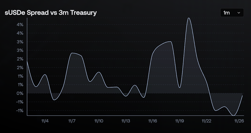 The driver behind this is unattractive carry. Following October’s OI wipeout, funding rates for BTC and ETH are muted to negative, with Ethena’s dashboard showing negative funding across majors. Since November, the sUSDe spread has been below three-month Treasury yields.