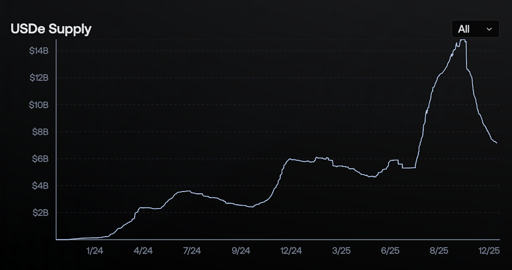 This year’s Oct. 11 liquidation episode was the largest in crypto’s history. A Trump tariff tweet sent BTC from about $120K to roughly $102K and wiped out about $19 billion dollars of open positions in 24 hours. USDe traded as low as $0.65 on Binance and about $0.92 on Bybit. Despite this, Ethena processed $1.9 billion of redemptions, maintained full backing and contained systemic contagion. Combined with Bybit’s February $1.5 billion exploit, this was a second major stress event that USDe passed with flying colors. However, despite that resilience, USDe supply has fallen almost 50% from the $14 billion dollar peak to about $7 billion.