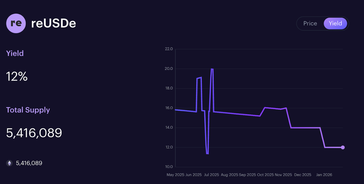 For context, a 91% combined ratio means Re Protocol pays out 91 cents in claims and expenses for every dollar of premium collected, keeping 9 cents as profit. Its tokenized products target yields of 15% to 23% for reUSDe (the higher risk insurance alpha product) and 6% to 9% for reUSD (the lower risk basis plus product). However, current live yields sit at 12% for reUSDe and 7.6% for reUSD.
