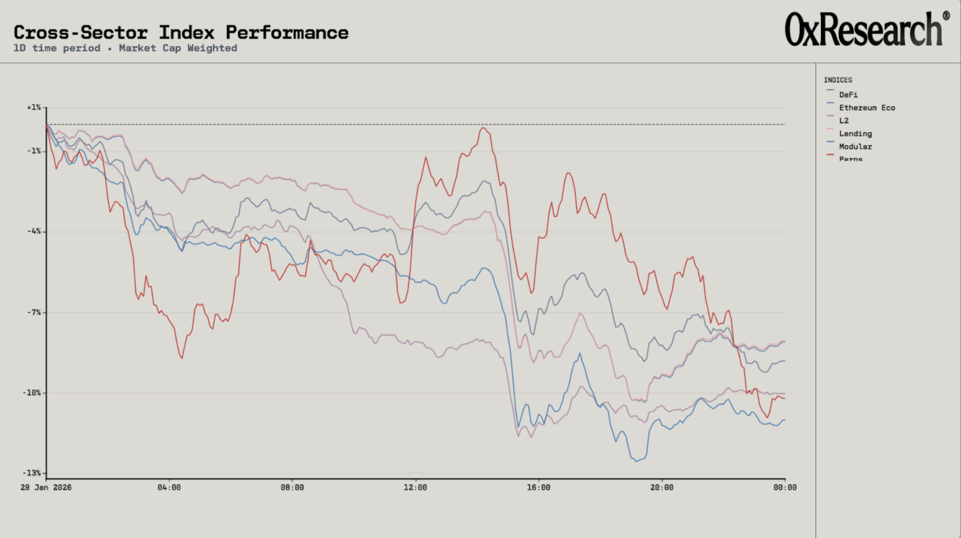 At the same time, US earnings season is keeping cross-asset volatility elevated. With megacap prints dictating index-level direction, risk appetite is being repriced in real time. Strong results are helping pockets of equities hold up, but guidance uncertainty and rate sensitivity are capping upside and keeping positioning defensive. In that environment, crypto has struggled to sustain rebounds, and yesterday’s sector-level drawdowns reflect broader unwillingness to add risk until macro and earnings volatility clears.