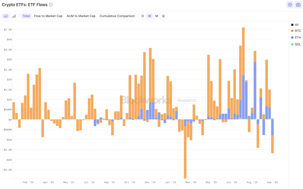 Well, US bitcoin ETF inflows stand at $57.3 billion. Ether ETFs have so far attracted $13.7 billion. That inflow difference more or less corresponds to the market caps for BTC (~$2.2 trillion) and ETH (~$500 billion).